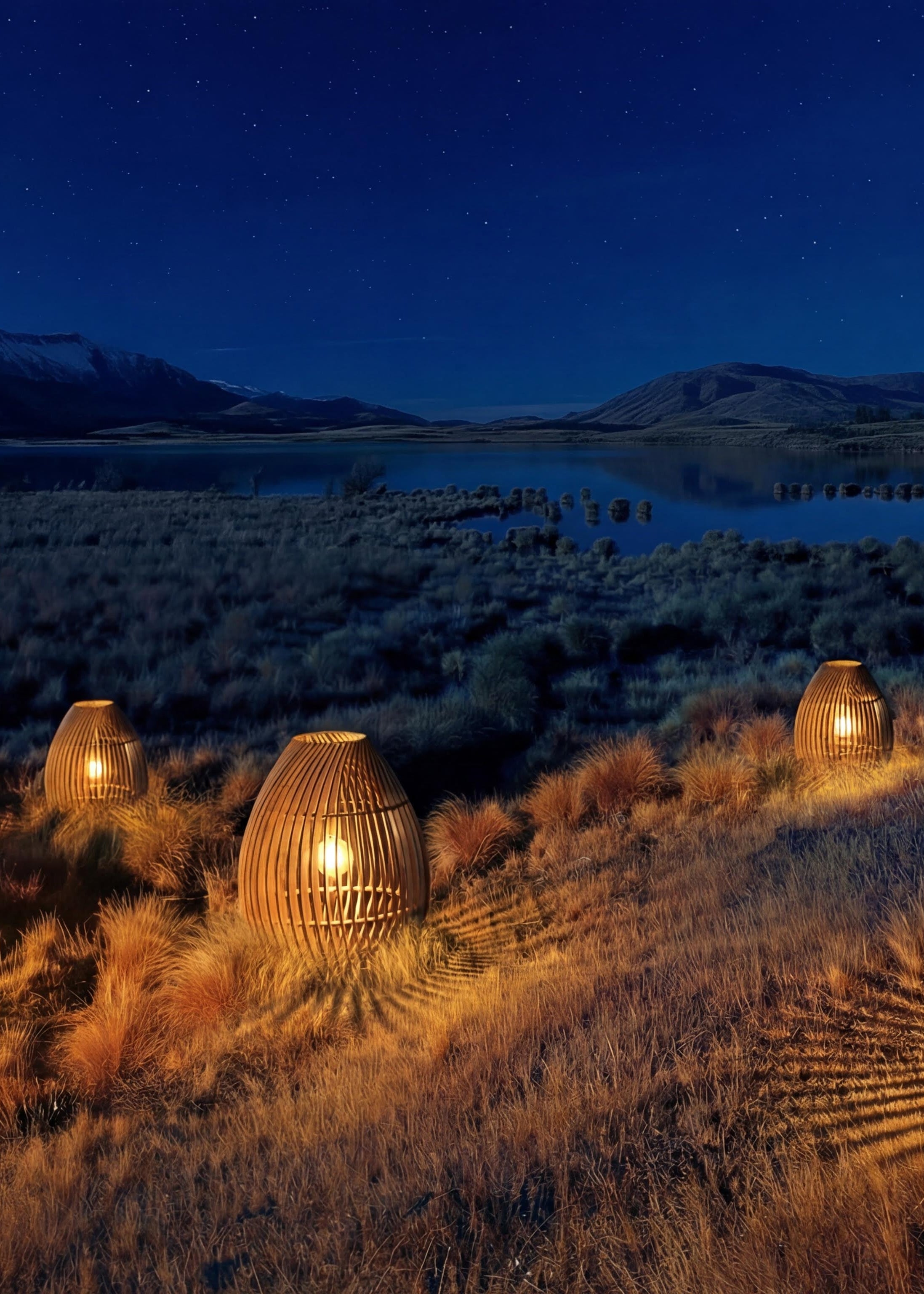 The Tussock lamp's design reflects the essence of these rugged grasses, using golden bamboo and sharp, pointed arcs. These elements create elegant shadows that mimic the Tussock form.